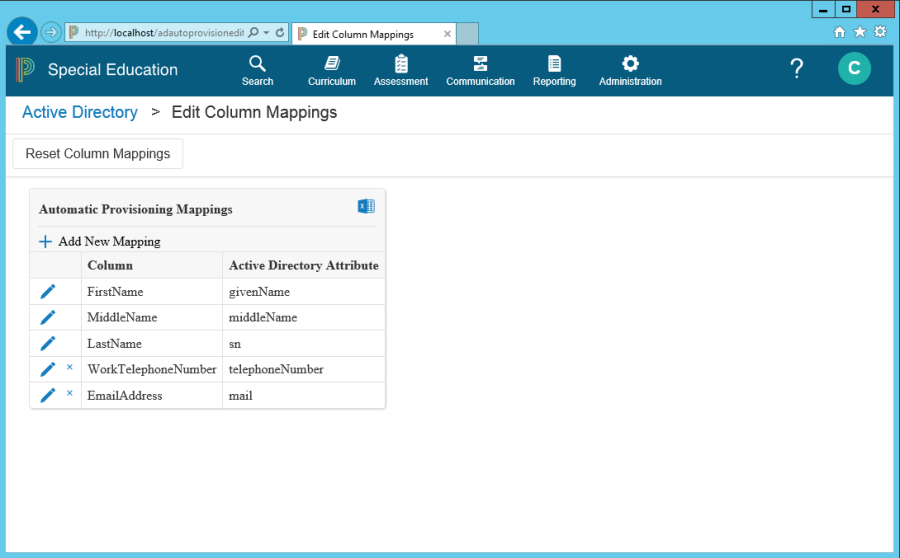 Click Edit Column Mappings to change the default mapping between AD users and PowerSchool Special Programs staff.