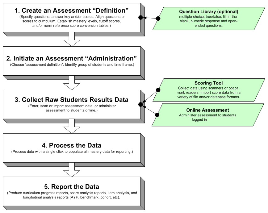 The process of collecting, analyzing/scoring, and reporting Student Assessment data using PowerSchool Special Programs involves the following steps: